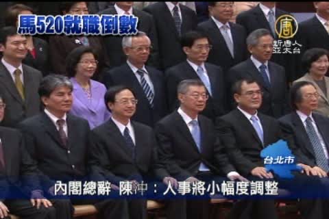 【新唐人亞太台2012年5月10日訊】行政院今天(10日)依憲政慣例,在520總統就職前提出內閣總辭。院長陳冲表示,馬總統連任之後,所有閣員第二任期已經開始,至於接下來閣員變動幅度,陳冲說,應該只有小幅度調整。