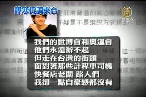 【新唐人亞太台2012年5月10日訊】大陸作家韓寒日前訪台,今天(10日)他在個人微博發表此行的感想,韓寒提到,他在台灣掉手機,計程車司機主動將他的手機送回飯店、還婉拒酬謝 ,讓他非常感動。他說,在微博中寫著,文化、法制和自由,就是一個民族的一切。他感謝香港和台灣庇護了中華文化,把這個民族美好的習性留下來,讓許多東西免於浩劫。