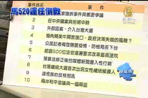 一百多位學者專家票選出的台灣十大民主事件,文林苑強拆案位居第一,二、三名則是旺中併購案與外部因素介入台灣大選。另外,媒體置入性行銷與一國兩區議題也都榜上有名,這些不只與兩岸因素有關,而且事件大多還在進行中。