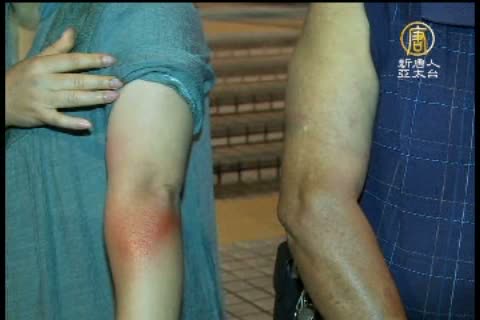 香港法輪功學員 尤薔薇:「朝著你的臉、手打來,另外一個拿漆油,又噴又打,打到這些地方都瘀青了。」