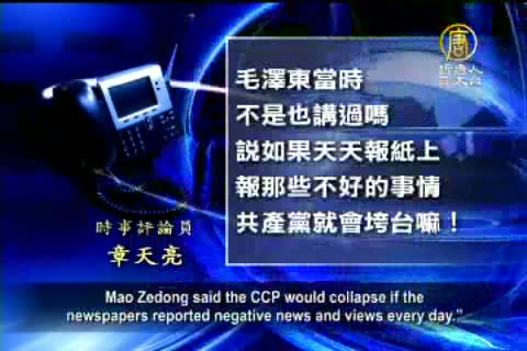 章天亮 :「《北京日報》有這種所謂的這種掌握輿論宣傳的主旋律啊,這就是毛澤東或者江澤民時代的一個典型做法。毛澤東當時不是也講過嗎,說如果天天報紙上報那些不好的事情,共產黨就會垮台嘛!」