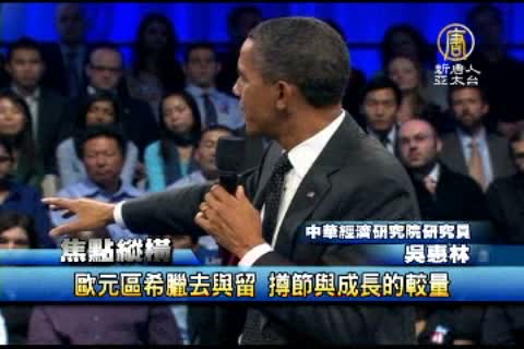 【新唐人亞太台2012年5月25日訊】隨著希臘各政黨組建聯合政府努力的失敗,一個困擾歐盟多時的問題,也從新成了熱門的話題,那就是:究竟希臘是不是會退出歐元區?而希臘馬上就要在6月17日進行大選,最新民調今天顯示,民眾最看好反撙節的激進左派聯盟勝出。撙節與刺激成長,兩個勢力如何在接下來的歐洲一分上下?我們今天的焦點縱橫,為您探討。