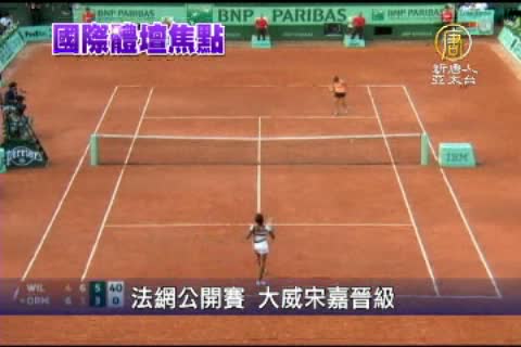 【新唐人亞太台2012年5月28日訊】大威廉絲與宋嘉順利晉級法網公開賽,而美國選手羅迪克對上法國選手馬育不幸淘汰。