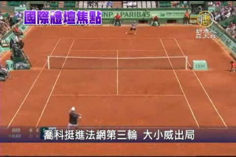 【新唐人亞太台2012年5月31日訊】法網公開賽,第一種子喬科維奇在第二輪順利過關,繼續挑戰大滿貫的旅程。球后艾薩蘭卡,也在30日以6比1、6比1輕鬆獲勝,挺進第三輪。而大小威廉絲,則是雙雙爆冷出局。