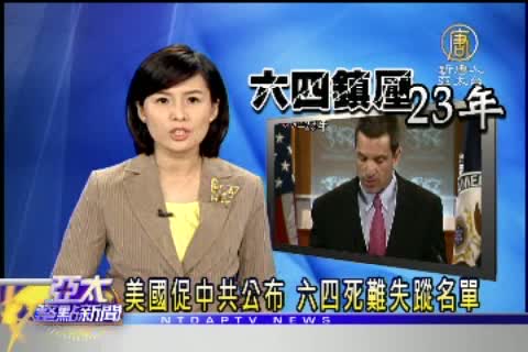 【新唐人亞太台2012年6月4日訊】面對中共血腥鎮壓1989年天安門民主運動二十三週年,美國國務院副發言人端納,在6月3日下午發表公開聲明,呼籲中國政府釋放因為參與1989年民運而仍被監禁的人、停止騷擾所有曾經參與示威活動的人士與家屬,並就被殺、被囚禁與失蹤的人做出公開交代。聲明還重申美國政府要求中共保障中國公民享有人權的呼籲,並要求釋放所有被使用錯誤的方法關押、定罪、監禁、強迫失蹤、被軟禁家中的維權人士,也呼籲中共當局停止騷擾他們的家屬。