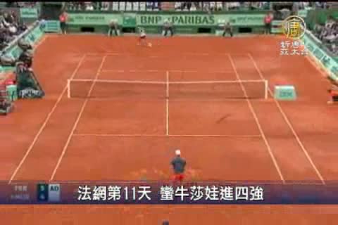 【新唐人亞太台2012年6月7日訊】法網第11天,蠻牛納達爾以衛冕冠軍之勢,擊敗同胞阿爾瑪格羅。進入男單四強。莎拉波娃在對上從未交手過的愛沙尼亞卡內皮也有好表現,以6-2 6-3,2盤直落進入4強。