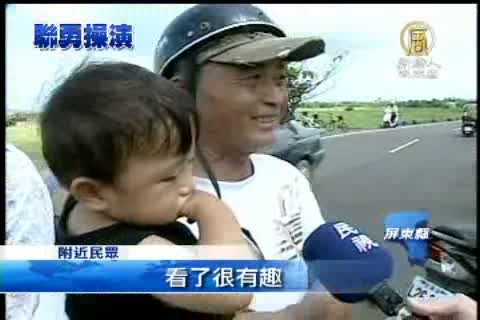 國軍聯勇操演在屏東三軍聯訓基地登場,戰鬥機、大砲,連番轟炸保山力頭,部份民眾一大早就來到附近的馬路邊占好位置,撐起大陽傘,準備感受轟炸的威力。