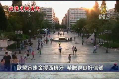 【新唐人亞太台2012年6月11日訊】關心歐債危機。對於西班牙獲得歐盟的金融救援支持,希臘社會黨領袖維尼澤洛斯星期天評論說,這對深陷經濟危機的希臘是個良好信號,表明歐元區國家有了一個安全網。