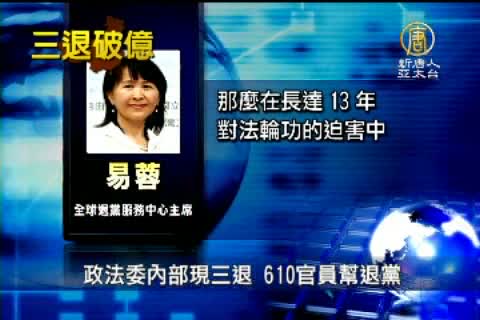 「全球退黨服務中心」主席 易蓉:「所以這種情況﹐610的也好﹐警察也好﹐現在是有不少﹐現在各個階層的現在都比較容易退﹐現在基本上幾句話退了的﹐很多這種情況﹐很普遍﹐不用像以前那樣費很大的勁﹐一次﹑兩次﹑三次﹐這樣好多次﹐才講退一個人﹐所以這種情形是挺好的。」