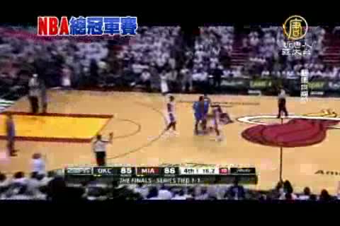 【新唐人亞太台2012年6月19日訊】美國職籃NBA總冠軍第三戰,17號來到邁阿密熱火主場舉行,熱火在比賽最後1分半鐘守住奧克拉荷馬雷霆的攻勢,最後以91比85擊敗奧克拉荷馬雷霆隊,贏得2連勝,在總冠軍賽取得2勝1敗的優勢。