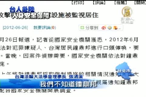 【新唐人亞太台2012年6月28日訊】被中共非法拘留的台灣法輪功學員、新竹科技公司經理鍾鼎邦,遭中共當局指控,2003年以來涉及蒐集機密文件與干擾大陸電視衛星訊號等觸犯刑法與國安的規定。對此,台灣法輪大法學會理事長張清溪表示,不知道鍾鼎邦是否參與電視插播,但是中共所指控的項目,不僅不是犯罪,還是替中國民眾突破訊息封鎖的正義作為。