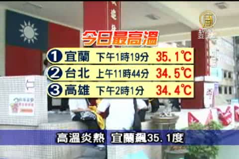 氣象局表示,今天全台灣氣溫都很高,出現最高溫的前3名,依序為宜蘭在下午1時19分攝氏35.1度、台北市上午11時44分34.5度、高雄市下午2時1分34.4度。