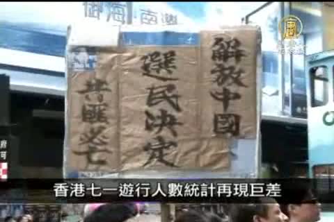 香港七一遊行,關於參與人數組織者和警方統計出現巨大差異。民陣發言人聲稱有40萬人參加遊行,並說這是8年來參加遊行人數最多的一次,顯示香港民眾普遍不信任新任特首梁振英。警方統計則稱遊行人數為6.3萬人。港大民意研究計劃的統計則認為遊行人數節育9.8萬至11.2萬人之間。