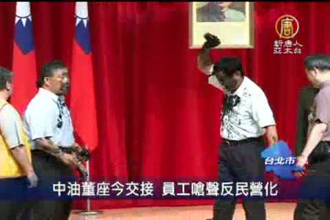 【新唐人亞太台2012年7月2日訊】台灣中油今天(2日)上午辦理董事長交接儀式,不過,這場交接典禮中也傳出一個小插曲,中油工會的代表強佔主席台十多分鐘並潑墨抗議,表達反對中油民營化和總部搬遷的立場,對此經濟部長施顏祥說會耐心溝通。