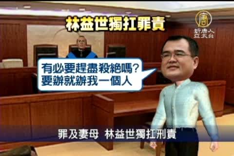 【新唐人亞太台2012年7月7日訊】好,那麼林益世收押禁見,不知道檢調已將他的太太和媽媽,列為貪污和洗錢罪被告,直到昨天首度借提才知情,為了獨自扛下刑責,他向檢察官說,錢都被他拿走,沒有共犯,要辦就辦他一個人。