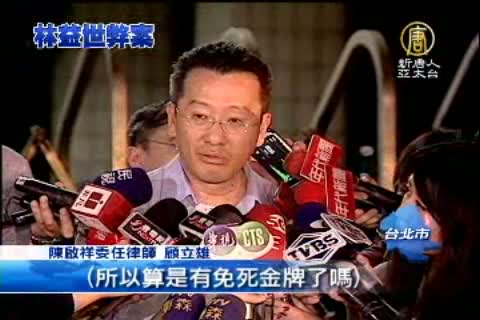 【新唐人亞太台2012年7月8日訊】特偵組偵辦林益世收賄案,這一個星期以來可以說是密集的展開收索以及約談的行動,而在昨天(7號)甚至是二度傳喚爆料的地勇公司負責人陳啟祥以及他的女友程彩梅,經過十個鐘頭的訊問,晚間二人請回,而陳啟祥的委任律師顧立雄就說,陳啟祥早在6月30日第一次訊問的時候,就兼具了被告以及證人的身分,也就是轉為汙點證人,未來將可能獲得減刑或者是免除期刑。