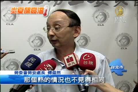 【新唐人亞太台2012年7月10日訊】氣溫不斷飆高,在戶外從事工作的民眾壓力真的很大,為了保護勞工的身體健康,勞委會證實正在和氣象局評估「熱浪假」的可能性。不過目前全球高溫下,大部分國家對高溫假並沒有制式的作法,倒是中國有所謂高溫津貼,對戶外工作的勞工有補助。