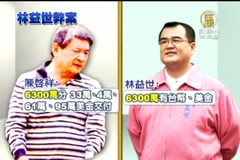 【新唐人亞太台2012年7月10日訊】偵辦林益世貪汙案,特偵組昨天二度借提在押的林益世,釐清收賄細節、金源流向,林益世供稱,陳啟祥給的6300萬,其中300萬台幣留下來私用,剩下的兩千萬台幣和121萬美金孝敬媽媽沈若蘭,不過,檢方質疑林益世說謊,因為陳啟祥給的全是美金,而且特偵組也已經查扣7500萬贓款,怎麼樣都兜不攏。