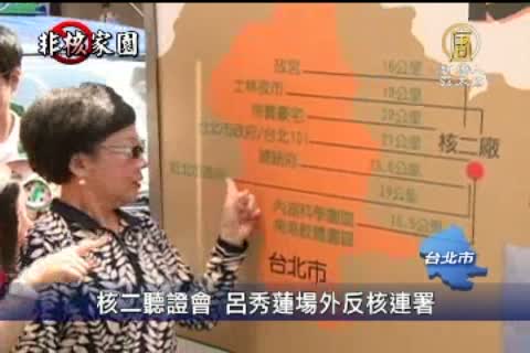 【新唐人亞太台2012年7月17日訊】原能會6月底通過重啟核二的決議,備受外界批判。原能會今天(17日)舉行「核二廠用過核子燃料乾式貯存設施」的建照執照申請案聽證會,引發反對聲浪,會場外,前副總統呂秀蓮也熱烈展開了反核公投連署。