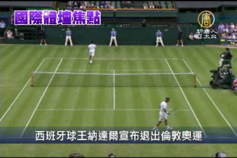 【新唐人亞太台2012年7月20日訊】距離倫敦奧運開幕,只剩一週的時間了。接下來,帶您看到一連串倫敦奧運的相關新聞。首先是,西班牙男網名將納達爾,在星期四宣布,退出倫敦奧運。這位08年北京奧運男單金牌得主,因膝蓋腳傷恢復狀態不夠理想,就在倫敦奧運即將登場的前一個星期,放棄參賽機會。