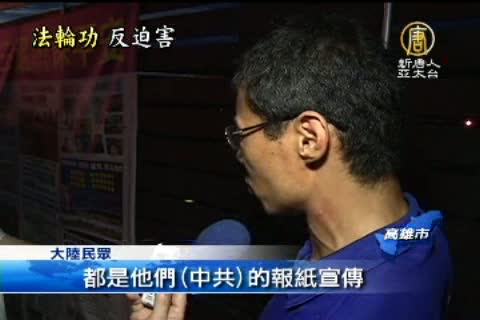 高雄民眾:「他們知道法輪功學員沒有錯,他們願意去支持他們,開始漸漸有意識說,他們要為一些沒有做甚麼錯事,然後是好人的人來發聲,那其實這是一個正義之舉。」