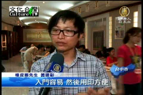 【新唐人亞太台2012年7月24日訊】傳統版畫使用木材為媒介,不但版材取得不易而且操作困難,知名創作藝術家「橡皮擦先生」黃建彰改以橡皮擦為版材,讓手作刻章輕鬆入門,還可以跟生活結合,讓民眾輕鬆感受到親手創作的樂趣。