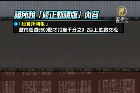 【新唐人亞太台2012年7月24日訊】至於證所稅的部分,將在明天正式闖關,不過針對財政部和國民黨推出的「修正動議版」,有國民黨籍立委認為,全球景氣不好,現在推動證所稅,時機不對,因此民進黨就批評,國民黨內部都沒有共識,法案也無法達到量能課稅,將要求退回委員會。