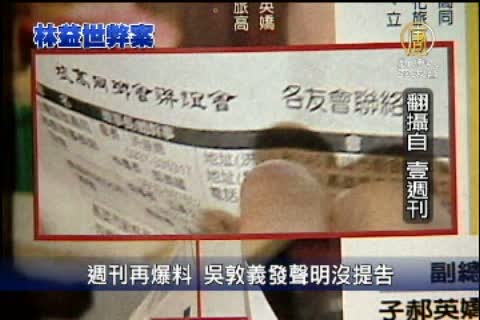 【新唐人亞太台2012年7月25日訊】副總統吳敦義捲入林益世弊案爭議以來,昨天首次透過律師發出聲明澄清。但最新出版的週刊再爆料,指吳敦義的小姨子阿嬌在今年6月,不但跟著吳敦義一起出席高雄餐會,甚至還幫忙核對名單,是吳敦義基層的輔選大將,另外在2001年,吳敦義回南投參選立委時,阿嬌也曾到吳門忠家裡,收下140萬的政治獻金。不過副總統辦公室透過律師團表示,不希望社會繼續把資源,浪費在爆料口水中,暫時不會有更進一步的動作,如果媒體或在野黨立委繼續抹黑他跟家人,不排除採取法律動作。