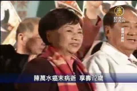 【新唐人亞太台2012年7月27日訊】接下來關心,親民黨主席宋楚瑜夫人陳萬水,在今天下午四點,驚傳因為癌末病逝於和信醫院,享壽72歲。消息一出,震驚各界,不過目前還沒有獲得親民黨方面的證實。今年總統大選時,就傳出陳萬水身體狀況不佳的消息,但是當時親宋人士公開闢謠說並非癌末,而宋楚瑜本人,對於陳萬水的健康情形也一向不多談。報導指出,陳萬水事實上早在2006年下半年,就被檢查出患有大腸癌,前後總共開過5次刀,但因為當時宋楚瑜全力拚台北市長選舉,陳萬水罹癌的事情就一直被高度保密。