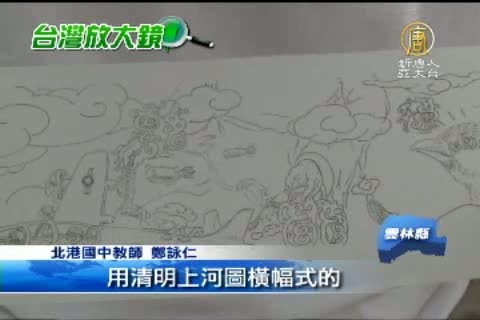 【新唐人亞太台2012年8月2日訊】也許您曾經在一些建築物的圍牆上,看見牆面彩繪,雲林北港國中師生,發揮巧思下,將牆面彩繪與地方文史相結合,他們花費數個月時間,完成了一幅總長84公尺的牆面彩繪,畫的是北港鎮的過去、現在與未來,我們帶您一起去看看。
