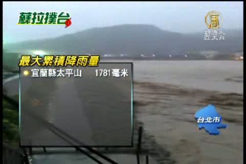 根據氣象局統計,從7月31日凌晨到今天(2日)下午6點,最大累積降雨量在宜蘭縣太平山的1781毫米,台中市武陵和新竹縣西丘斯山累積雨量也破千,分別有1194和1066毫米,花蓮縣和中也有922毫米、新北市四堵和台北市鞍部,分別為879毫米和704毫米,高雄市民生及台南市曾文,降雨量也超過335毫米。