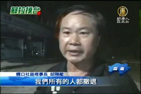 阿里山公路觸口路段,一大片山壁整個崩落,樹木挾帶土石,把明隧道壓在下面,導致通道明隧道的路完全被土石擋住。路旁這戶店家一半被埋在土石堆下,還不斷有山洪流下來,周五晚間七點左右,走山發生十分鐘前,居民已經有預感,及時逃命。