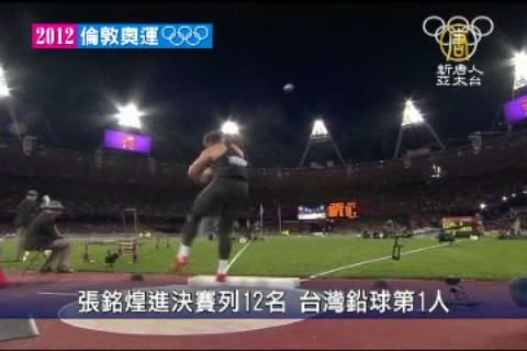 【新唐人亞太台2012年8月4日訊】「鉛球王子」張銘煌在倫敦奧運闖進決賽,在決賽擲出19公尺99的成績,以第12名作收。但他是繼楊傳廣、紀政之後,台灣再度有選手挺進奧運田徑決賽,更是台灣鉛球史上擲進決賽的第一人。為您整理中華隊奧運健兒的最新賽況。