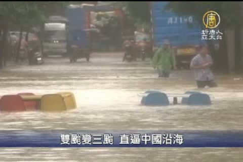 【新唐人亞太台2012年8月4日訊】颱風蘇拉和達維星期六,繼續襲擊中國大陸東南沿海一帶, 中國 氣象中心表示, 同時遭受 兩個颱風南北夾擊,今年第11號颱風海葵又已經生成,從雙颱變成三個颱風,大陸沿海受災地區恐怕將面臨嚴峻考驗。