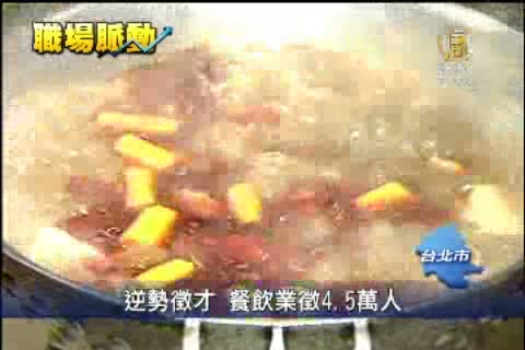 【新唐人亞太台2012年8月10日訊】受到進、出口經濟動能不佳的影響,不少廠商在提供就業機會上,也趨於保守,不過餐飲業卻逆勢操作大舉徵才,光是連鎖速食店麥當勞,就開出了1萬5千個職缺,還有連鎖麻辣鍋以及餐廳,徵才人數將近4萬5千人。