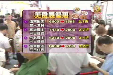 繼續排隊繼續買,畢竟美食展重頭戲,就是搶優惠,今年最低折扣有2家,是遠東飯店雙人套餐和高雄圓山飯店住宿券,通通下殺2.7折,算一算,至少省下快 5000元,台北圓山及晶華飯店,平日住宿券也折扣到3.1及3.2折,入住一晚,晶華只花4300元,圓山則是2000元。