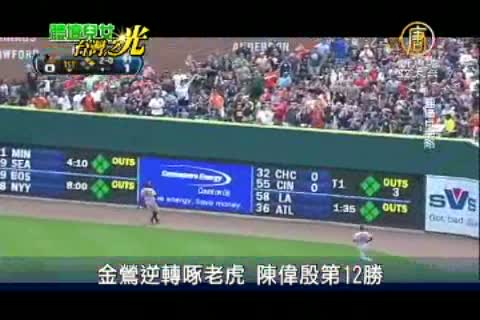 【新唐人亞太台2012年8月20日訊】來關心陳偉殷在美國職棒的最新戰況。陳偉殷在客場先發迎戰老虎隊,雖然第1局就掉5分,但是隨即回穩沒再掉分。金鶯打線發揮,在第2局先追回4分,第4局再下3城,終場以7比5擊敗老虎,陳偉殷拿下第12勝。