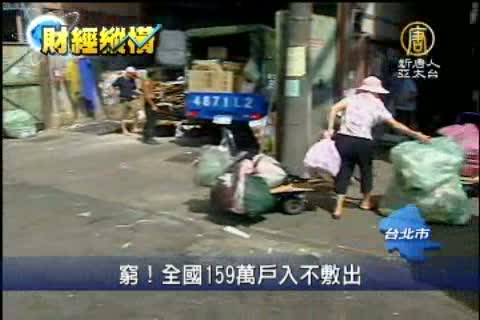 【新唐人亞太台2012年8月20日訊】物價漲不停,只有薪水不漲,這是一般民眾的感受,而根據主計處統計,全國有159萬戶入不敷出,支出比收入還要多近3萬元,是史上次高,而平均每戶儲蓄金額也只剩下17.9萬元,達到20年來的最低紀錄。
