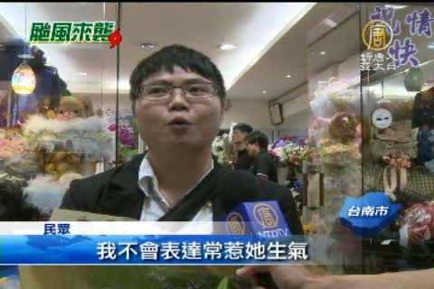 今天是七夕情人節,趕在颱風來臨前,男士到花店買花,向伴侶表達心中情意。