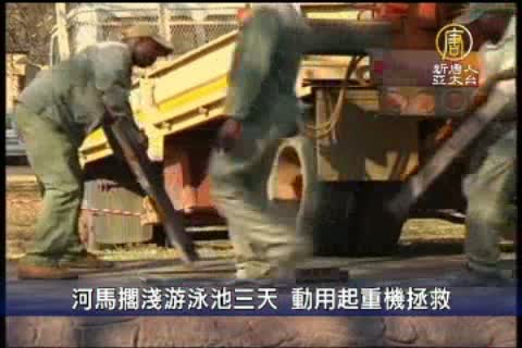 【新唐人亞太台2012年8月24日訊】南非林波波省一處遊樂園區內遊泳池擱淺一隻河馬已經三天了,園方捕捉團隊星期五(24日)計畫動用起重機將牠救起。