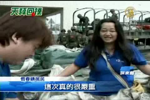 【新唐人亞太台2012年8月27日訊】中度颱風天秤回頭,發布陸上颱風警報。屏東縣下午率先公布,今天晚上停止辦公、停止上課的消息。而公路總局,也在經過評估後,決定從晚間6點30分起,預警性封閉阿里山公路全線路段。另外,台東17所學校遭天秤颱風侵襲,都還沒復建,如今天秤再來,恐怕影響學校開學。因此面對天秤回撲,屏東縣政府和鎮公所,緊急準備了多達5000多個沙包,進入高度備戰狀態。