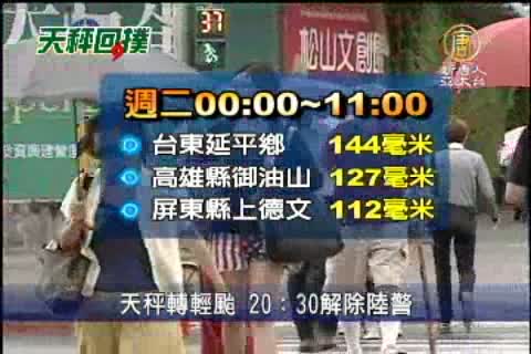 儘管天秤颱風強度,已經在今天上午,減弱成一個輕颱,暴風圈挾帶的雨勢,仍然不能輕忽。 從今天凌晨累積到上午11點,台東延平鄉達到144毫米,高雄縣御油山也有127毫米,第三名屏東縣上德文,則有112毫米,包括高雄縣,屏東,台東,花蓮,以及宜蘭,都被氣象局列為豪雨警戒區,至於北部地區,預估越晚雨勢越明顯。
