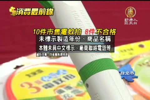 【新唐人亞太台2012年8月30日訊】電蚊拍似乎已經成為家庭必備的防蚊家電,不過,民眾在購買前可要多加留意,今天(30日)標檢局與消基會公布,市售電蚊拍的抽測結果,不合格數高達八成。
