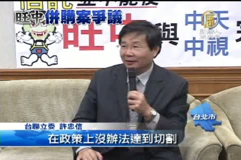 【新唐人亞太台2012年8月31日訊】旺中併購案雖然有條件通過,不過,後續旺中集團要如何與中天新聞切割,依舊是外界關注的話題。立委許忠信今天(31日)說,如果旺中信託中天中視股權,實質上並沒有切割,旺中集團還是可以影響電視台的決策。