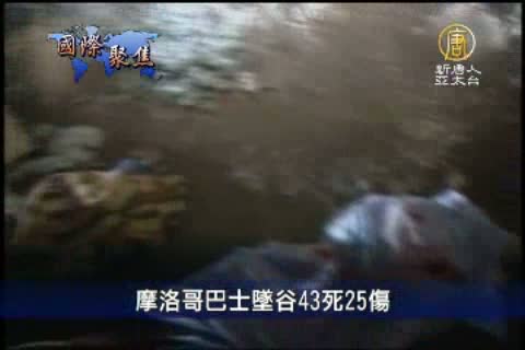 【新唐人亞太台2012年9月5日訊】9月4號,北非摩洛哥的一輛巴士,在行經南部地區的山路時,偏離車道墜入溪谷,這起重大事故的造成43死、25人輕重傷,傷患已緊急送往附近醫院接受治療。