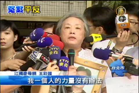 【新唐人亞太台2012年9月6日訊】江國慶冤死案,針對陳肇敏等軍官,刑求、濫權追訴部份,北檢日前作出二次不起訴處分。今天(6日)上午江媽媽捧著江國慶照片,到台北地檢署遞狀聲請再議,才剛無罪定讞的蘇建和、莊林勳也到場聲援,對於北檢不起訴處分,江媽媽哽咽的說她不能接受,要請大家幫幫忙。