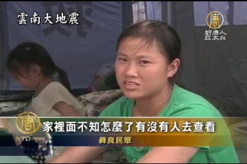 彝良民眾:「地震後我們現在住在了這裏,可以讓我的孩子上學。我們的房子,我不知道他們是不是去看了。我的婆婆和母親也在房子裏,我不知道她們是不是獲救了,我不知道她們現在在哪裡。」