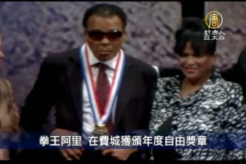 【新唐人亞太台2012年9月15日訊】美國費城國家憲法中心獨立紀念館,週四(13號)將今年的年度自由獎章頒給了世界拳王阿里,用來表彰他在信仰自由和人道關懷方面的努力。