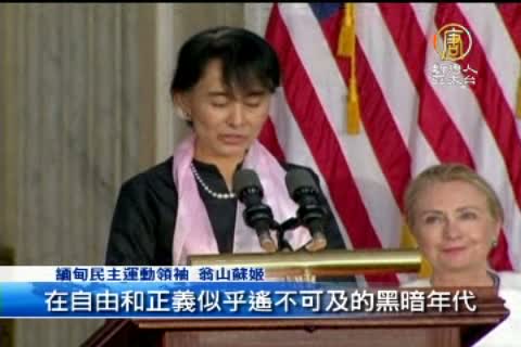 翁山蘇姬在美國國會接受頒發金質獎章的榮譽。這個獎章和總統自由勳章並列為美國最高的平民榮譽。翁山蘇姬上台領獎後,對美國支持緬甸民主表示感謝。