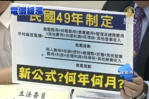 【新唐人亞太台2012年9月22日訊】12月的電價確定延緩調漲,不過馬總統日前提出讓電價回歸市場化,改採浮動電價,遭在野立委質疑,台電在台灣的電業市場具有壟斷性,況且現行的電價公式已經沿用半世紀,早就不合時宜,要推浮動電價,先交出電價計費公式。